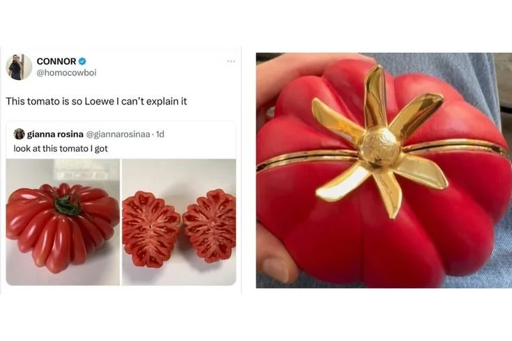 Once upon a runway, luxury meant cashmere, calfskin, and couture. Now, it might also mean a tomato. A perfectly sun-ripened one — cradled in linen, stamped with a Loewe logo, and shot in soft morning light.